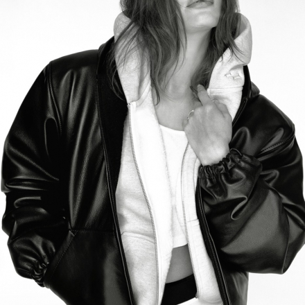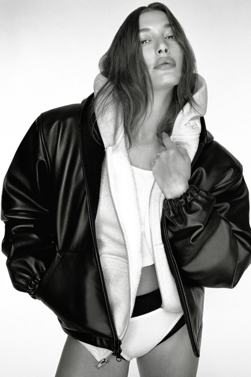The centerpiece of the collection is an oversized leather zip-up jacket — the piece that instantly makes any look feel luxurious and confident. It is complemented by oversized hoodies, micro-shorts, and cropped tops. The slightly structured shoulders are Hailey’s signature touch, already established as her street-style trademark.