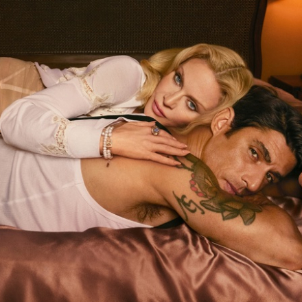 The campaign was shot by Mert Alas, and the result is both intimate and cinematic. In the images, Madonna reclines on satin sheets, surrounded by soft light and a barely perceptible tension. In one shot, she appears in the arms of actor Alberto Guerra, while in another, she is completely alone.