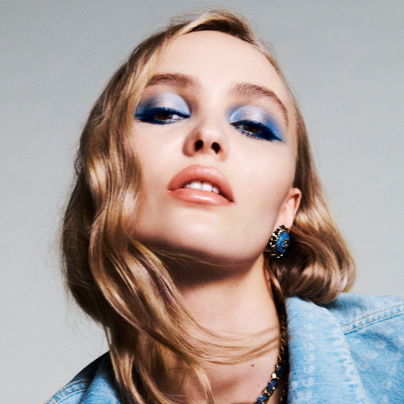 Lily-Rose Depp aparece en la campaña como si estuviera inspirada por cada detalle de la colección: azul oscuro mate en los párpados, un suave brillo denim en los labios y un ligero acento en los pómulos. Un look a la vez audaz y refinado, perfecto para un paseo nocturno o una salida diurna con estilo.