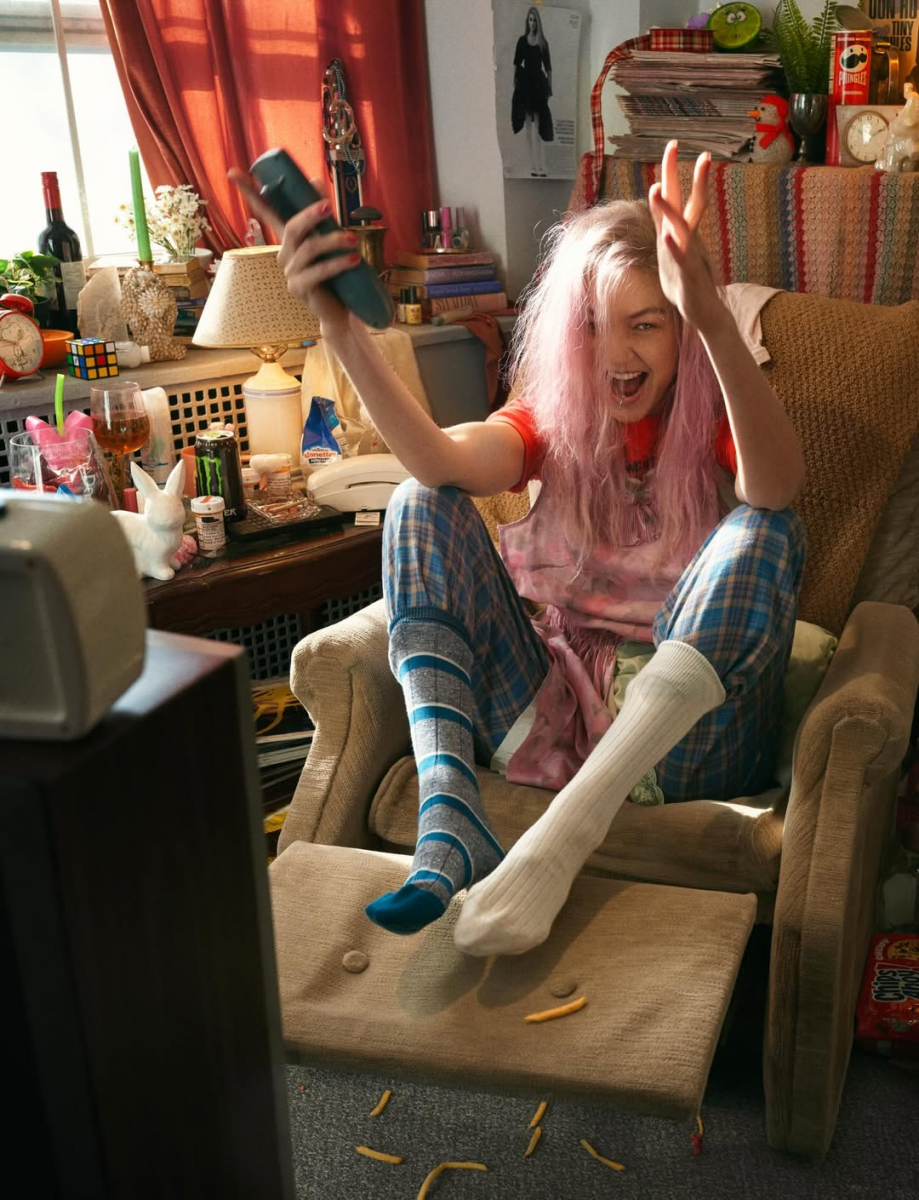 U editorijalu za LOVE: DEAD SERIOUS, Gigi nije samo manekenka — ona je lik. Žena očarana obećanjem savršenstva.