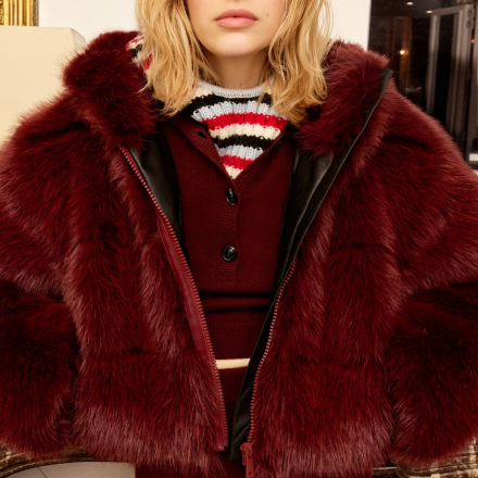 Tra i pezzi di punta, il piumino bordeaux in ecopelliccia, corto sui fianchi con un accattivante punto vita sagomato, cattura immediatamente lo sguardo. Per chi preferisce lo stile “street” senza affrontare le piste da sci, i pantaloni in pelle bordeaux con leggero flare e zip sul polpaccio reinterpretano le classiche silhouette da sci. Gli accessori — stivali alti “moon boots” in ecopelliccia e cappelli con pompon — sono perfetti sia per passeggiate nei paesini innevati sia per i mercatini di Natale.