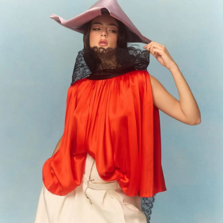 Красная блуза с вуалью, создающая эффект лёгкой мистики и воздушности;